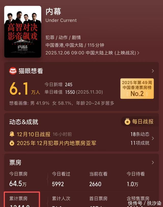 但结合其4000万的成本来看,这种成绩已经称得上相当惊喜,正午阳光都赢麻了。 而相比之下,港片《内幕》才是真的丢人。 目前影片的票房居然仅有1200万,预测总票房也才2000多万,惨遭贺岁档垫底,被打的毫无还手之力。